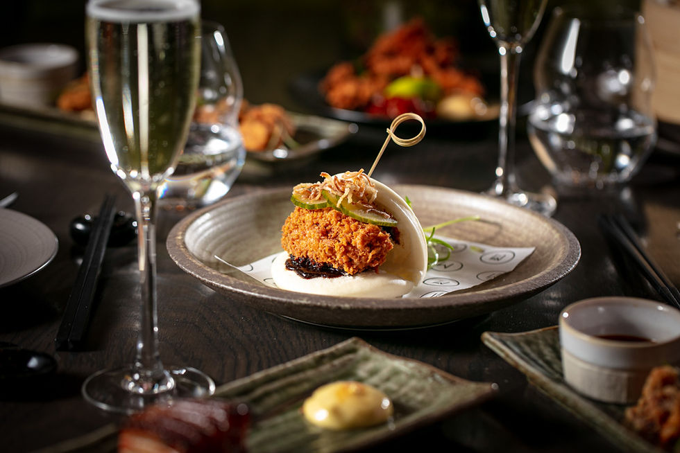The menu is a ‘set menu’ (with options) – a round of starters is enjoyed for the table so everyone shares Fried Chicken and Crispy Squid followed by your personal choice of Dim Sum (Wagyu & Pork, Pork & Kimchi, or Mushroom & Leeks V Ve), choice of Bao Buns (Wagyu Beef or Tofu V), AND Yakitori (Pork Belly or Celeriac V).