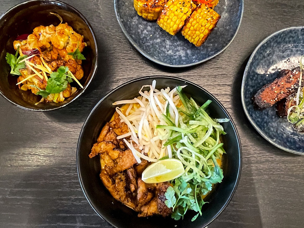 We also tried the Sticky vegan ‘ribs’ made from mushroom, seitan and soya protein. I must say I was apprehensive at first, as I’m a big fan of ribs, but this dish blew me away! A real favourite of mine now! Sticky, smoky, sweet, and quite meaty for a vegan dish, it was very moreish and is an absolute must-try! Next up The Bang bang cauliflower, crispy wok-fried cauliflower, coated in firecracker sauce with red and spring onion, and garnished with fresh ginger and coriander. This flavoursome dish is tangy with a spicy kick, giving you a bang for your buck.